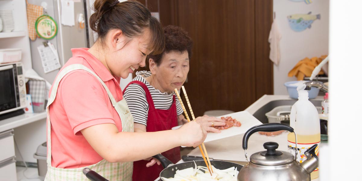利用者様が自宅と変わらない普段の生活を送れるように、散歩に行ったり、台所に入り一緒に食事を作るなど、コミュニケーションを取る時間を大切にして、一人ひとりに寄り添えるように支援をさせていただいています。